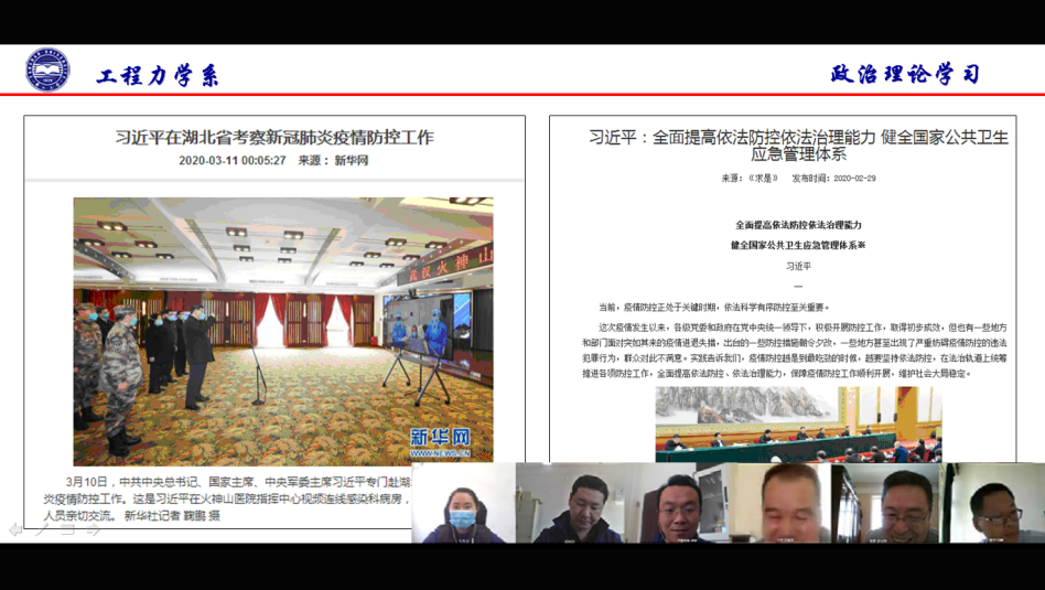 各单位以“学习强国”、腾讯会议为载体,组织全体师生开展本学期第一次政治理论学习。通过原文领学、观看新闻视频、交流发言、心得分享等方式,重点学习习近平总书记就疫情防控作出的一系列重要指示批示精神和党中央的重大决策部署等内容,全面把握党中央关于疫情防控工作的各项部署要求,深刻体会疫情防控期间彰显出来的中国特色社会主义道路、理论、制度、文化的优势,坚定中国特色社会主义的“四个自信”。