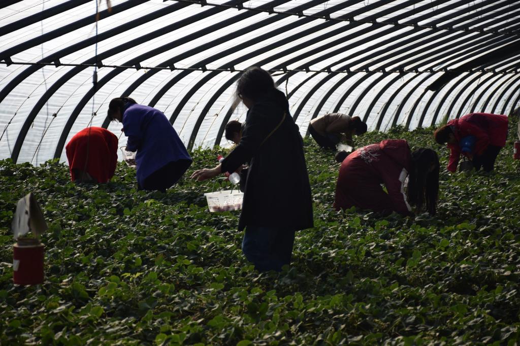郊区的采摘园一片生机勃勃,翠绿的叶子、鲜红欲滴的果实、芬芳的果香都让人感到春天到来的曼妙脚步。大家一边摘草莓一边互相交流,零距离感受田园风光,体验了采摘草莓、品尝鲜果的乐趣,陶醉于春意萌动的生机。一个小时后,每个人都收获满满。