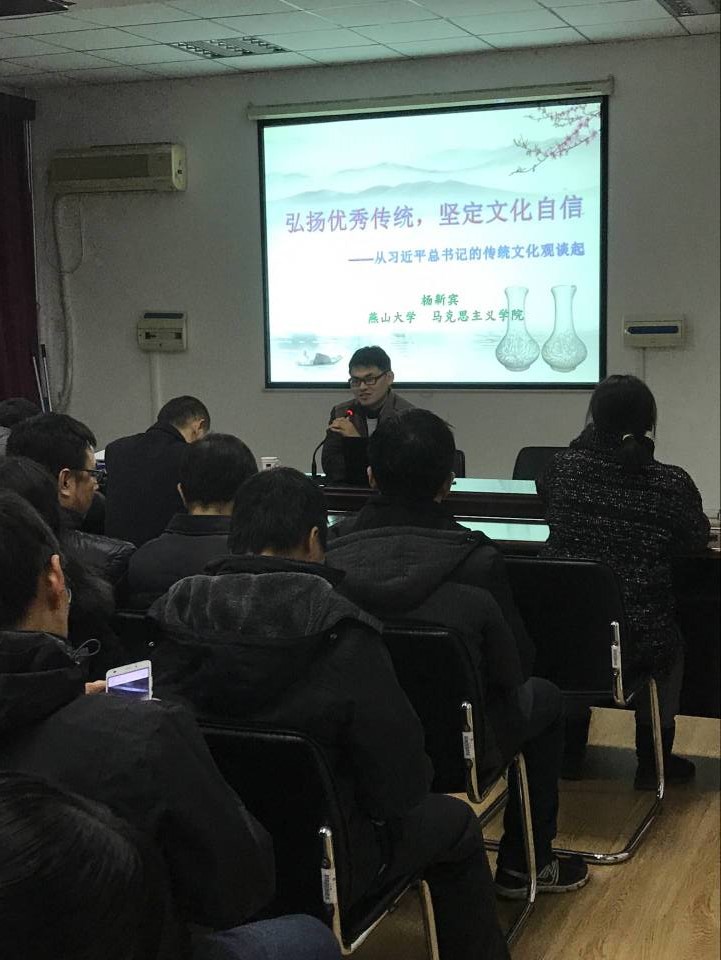 杨新宾老师从习近平的传统文化情结、习近平传统文化观的公用维度、层次维度以及创新维度四个方面阐述了习近平总书记的传统文化观。杨老师的语言通俗易懂,引人入胜,分析透彻,讲解详细。最后,杨老师引用“究天人之际,通古今之变,撷中外之华,成一家之言”结束了本次讲座。