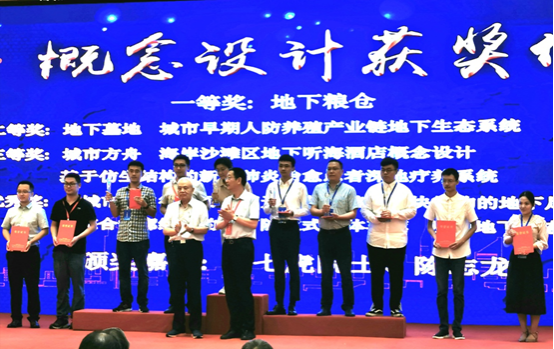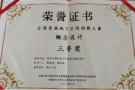 曹海莹老师与其硕士研究生穆壮尉共同完成的设计作品“海岸沙滩区地下听海酒店概念设计”,从全国700余份作品中脱颖而出,获得大赛三等奖。国家最高科学技术奖获得者钱七虎院士和全国工程勘察设计大师陈志龙为获奖者颁奖。