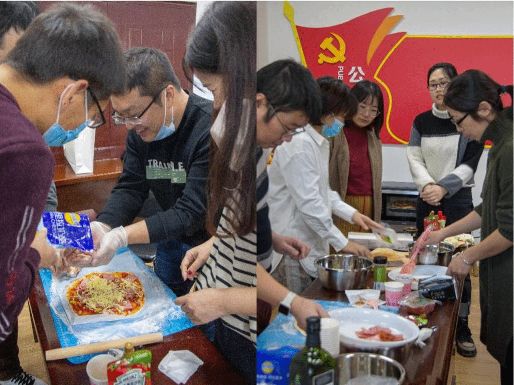 工会悉心准备了烘焙披萨所需的材料。在徐珊老师精彩的分享后,老师们齐心协力、分组协作,经过一小时的努力,完成了各自披萨处女作。建筑馆楼道里都飘起了阵阵香气,惹人垂涎欲滴。同事们分享着自己烘焙的披萨,纷纷为对方竖拇指点赞!