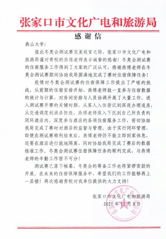 辅导员燕博老师在冬奥会系列测试赛期间协助张家口市文化广电和旅游局圆满完成赛时住宿保障任务表示感谢。