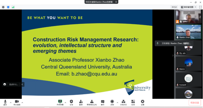 邀请,澳大利亚中央昆士兰大学(Central Queensland University)工程技术学部副教授、博士生导师赵宪博博士,为全院师生做了题为“工程风险研究前沿”的学术报告。报告重点分析了2000年来工程风险管理知识体系的演变、风险体系的智能结构以及可能涌现的研究热点,为全面掌握工程风险研究脉络,探索工程风险研究前沿提供了新视角。