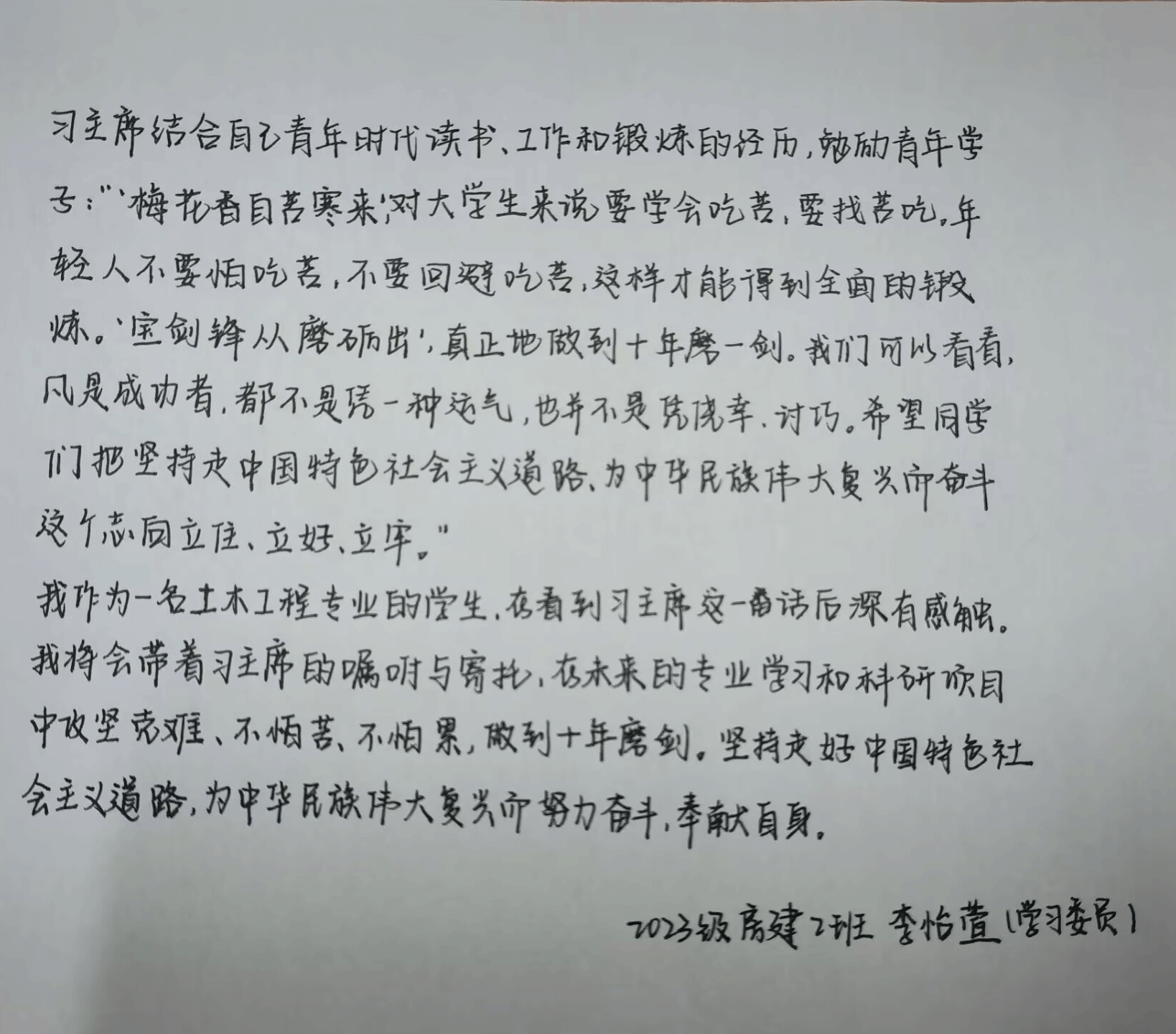 建筑环境与能源应用工程3班班长蒋晓山同学也分享了自己的感悟:“我深切领会到习近平总书记对大学生始终如一的关怀,习近平总书记强调青年要‘自找苦吃’、扎根基层、投身实践 ,把个人理想融入国家发展。作为建环专业的新时代大学生,我们应牢记这些嘱托,在专业领域不断钻研,用所学优化建筑环境,为能源高效利用出力,诠释青春担当,不负时代,不负韶华。”