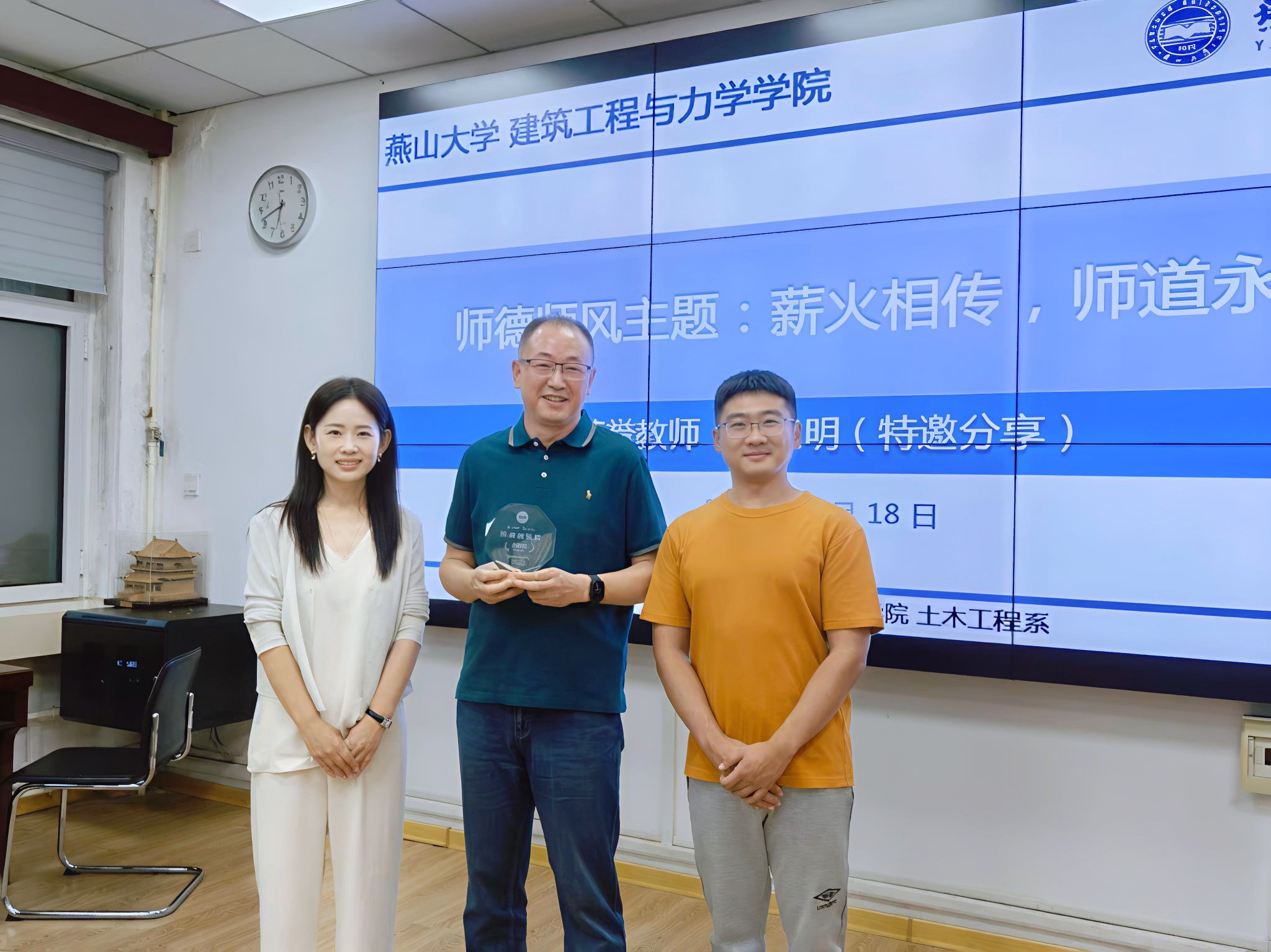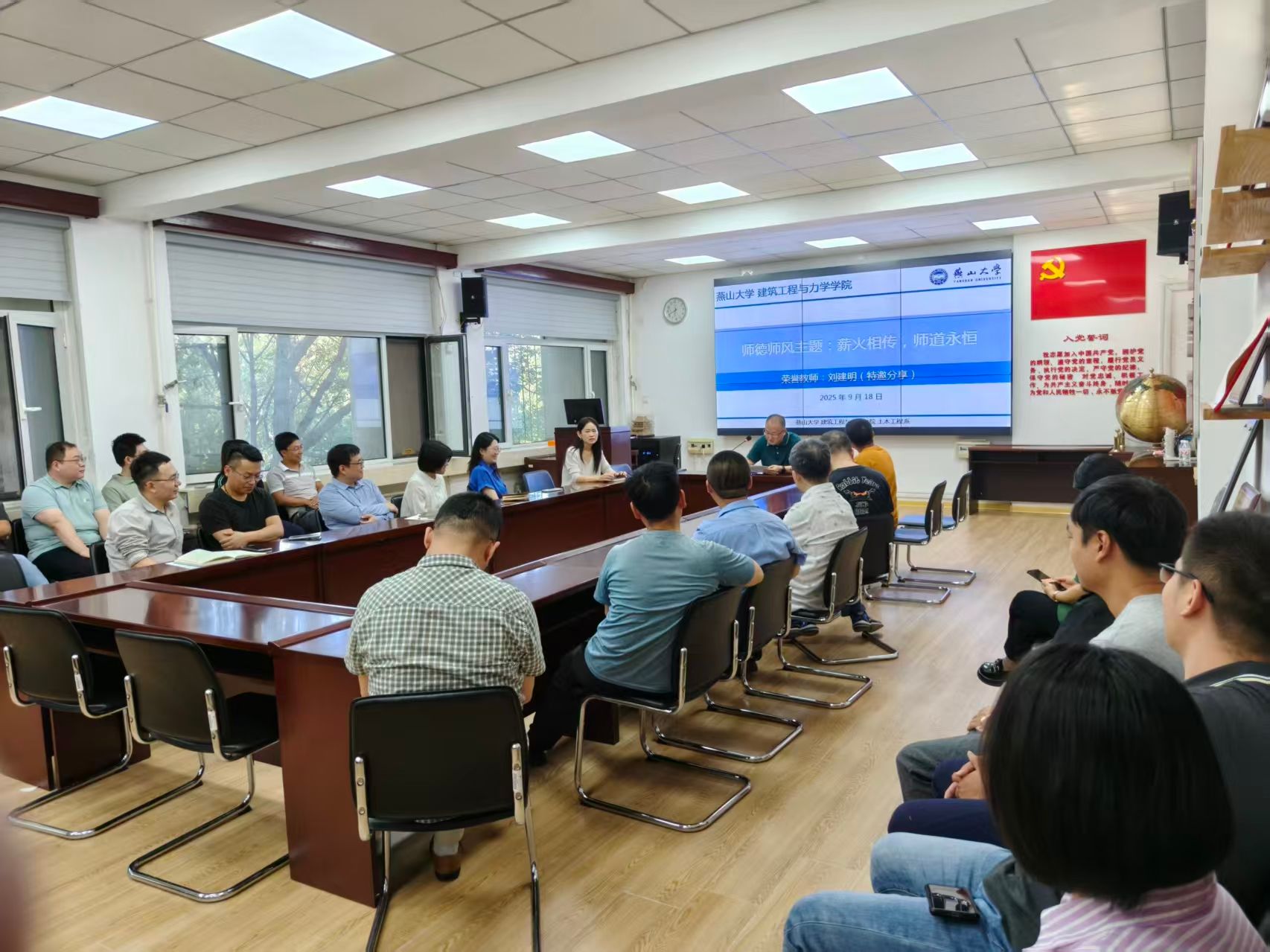 会议第二阶段开展了以"薪火相传,师道永恒"为主题的师德师风建设活动。土木工程系特别邀请了退休荣誉教师刘建明老师回校开展专题座谈。