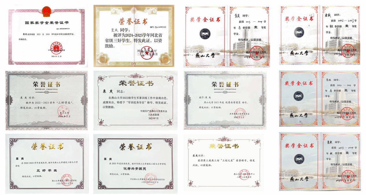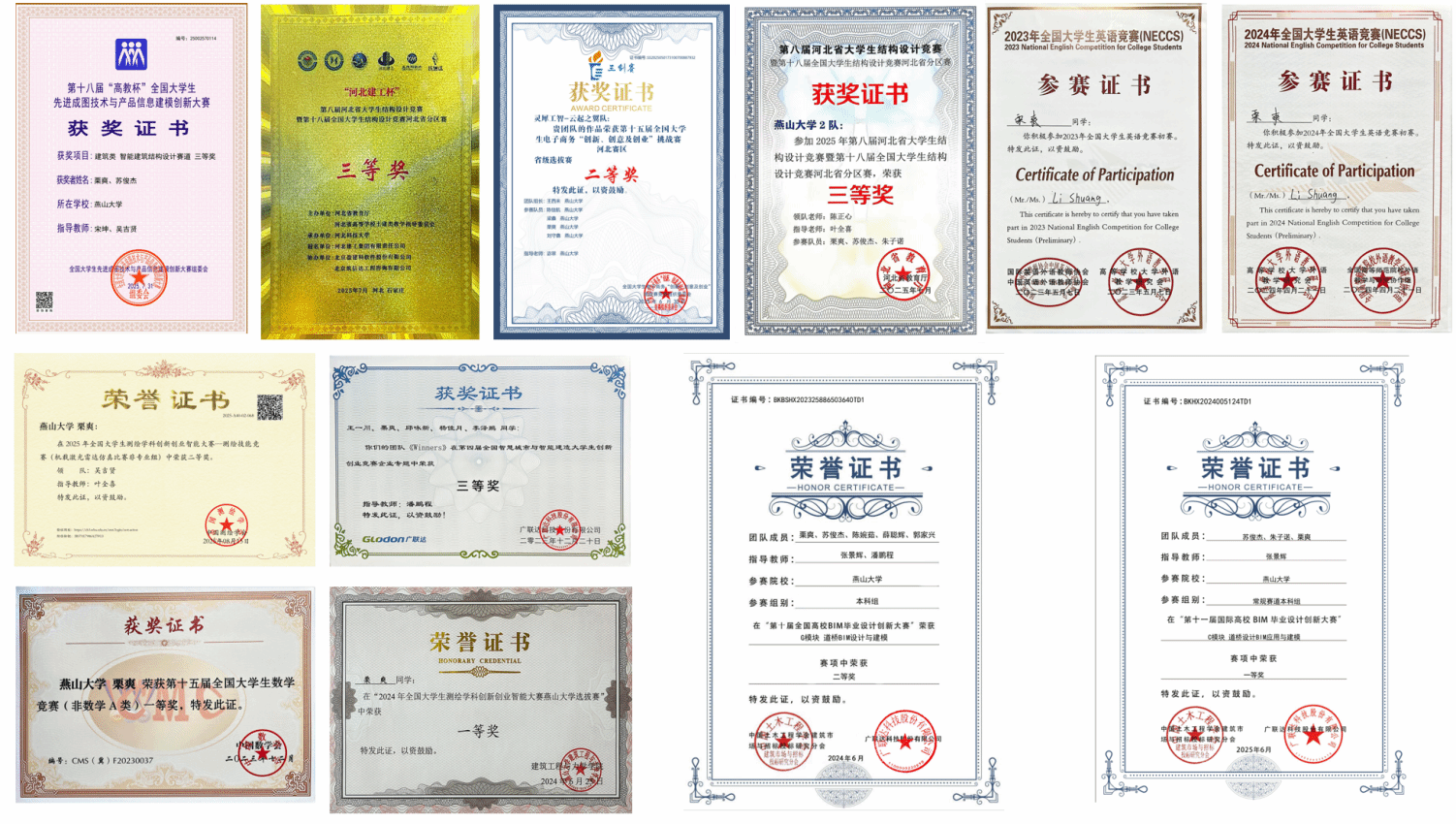 第一名,河北省一等奖、第十八届全国大学生结构设计大赛河北省分区赛省级三等奖(担任队长),累计获得5项国家级奖项、3项省市级奖项和10余项校级奖项。